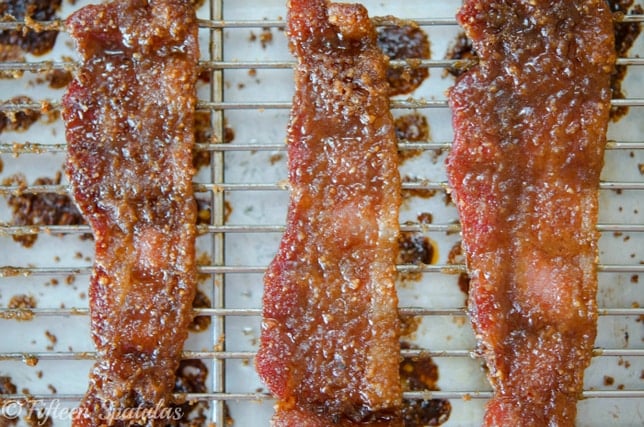 It’s bacon that’s roasted with a pulverized pecan brown sugar until it has caramelized.