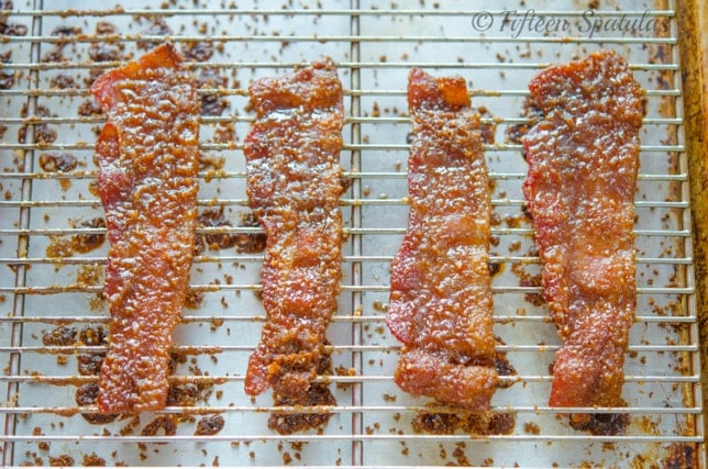 - Press each bacon slice into the brown sugar pecan crumb, making sure to get both sides and shaking off the excess. Then place the prepped bacon slices on the wire rack. Bake for about 30 minutes until the brown sugar has caramelized. Let the bacon cool slightly, but enjoy while hot and fresh out of the oven.
