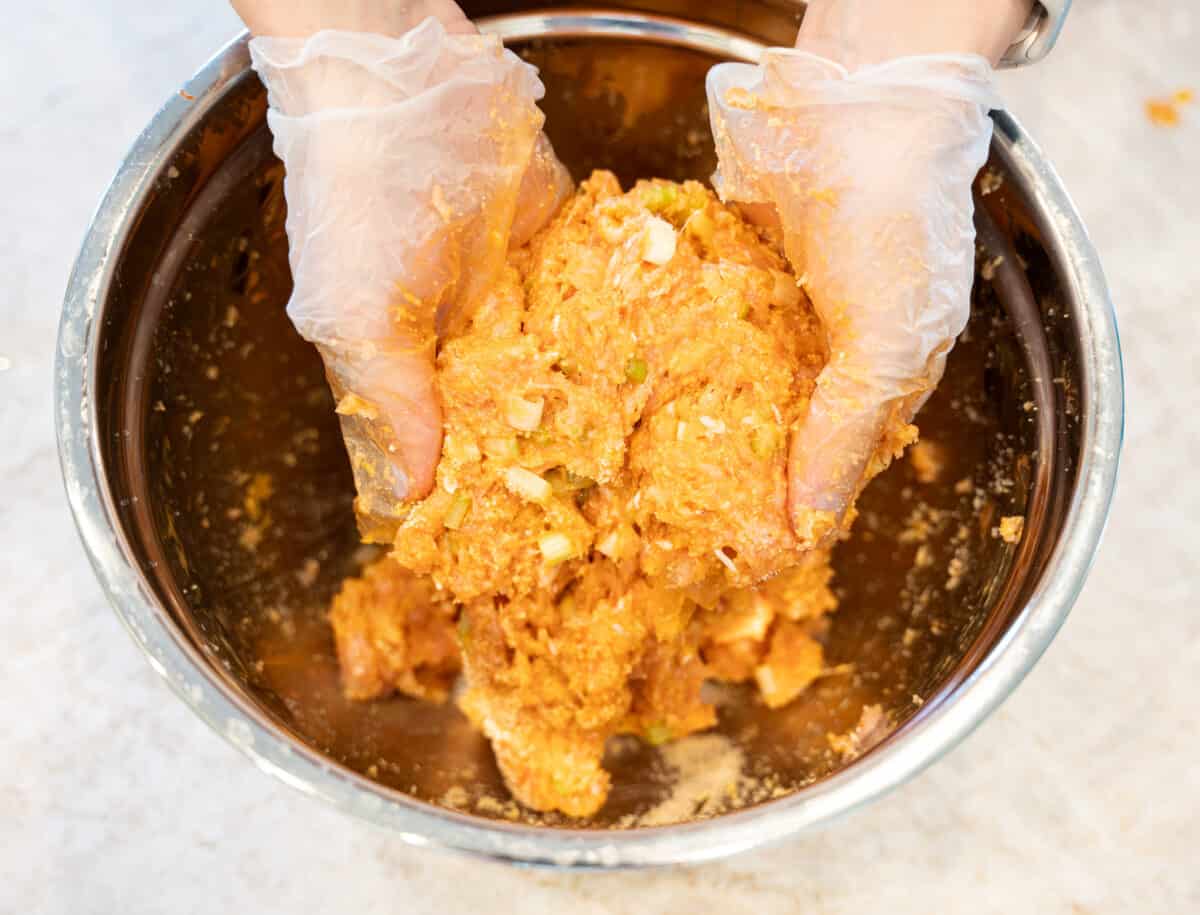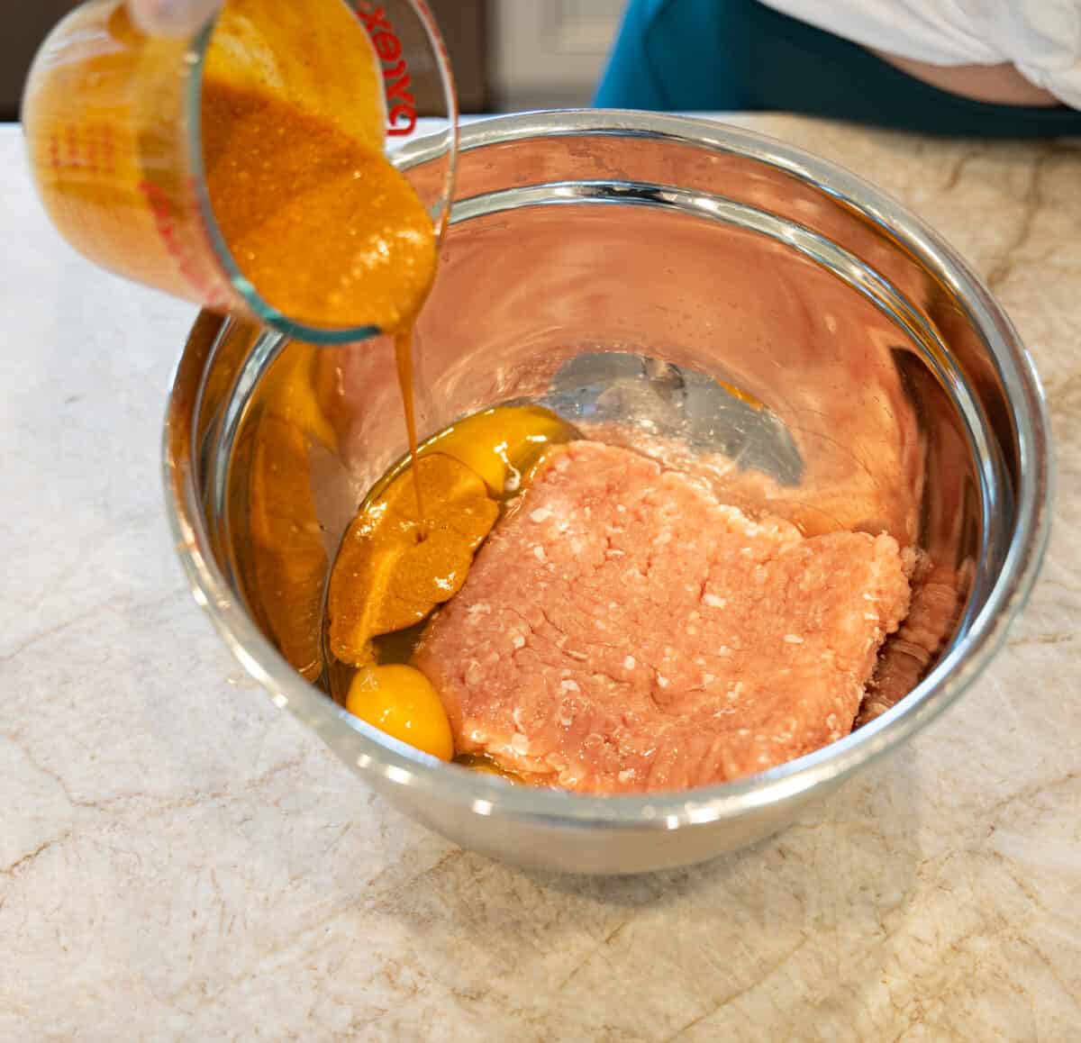 - In a large bowl add the ground chicken, eggs, and half of the prepared creamy wing sauce. Combine.
